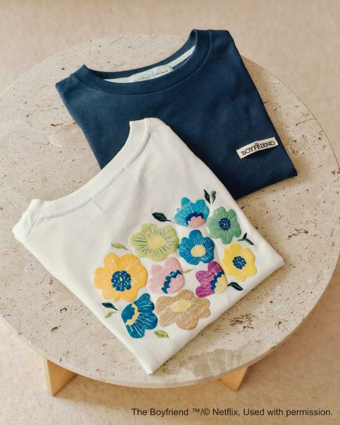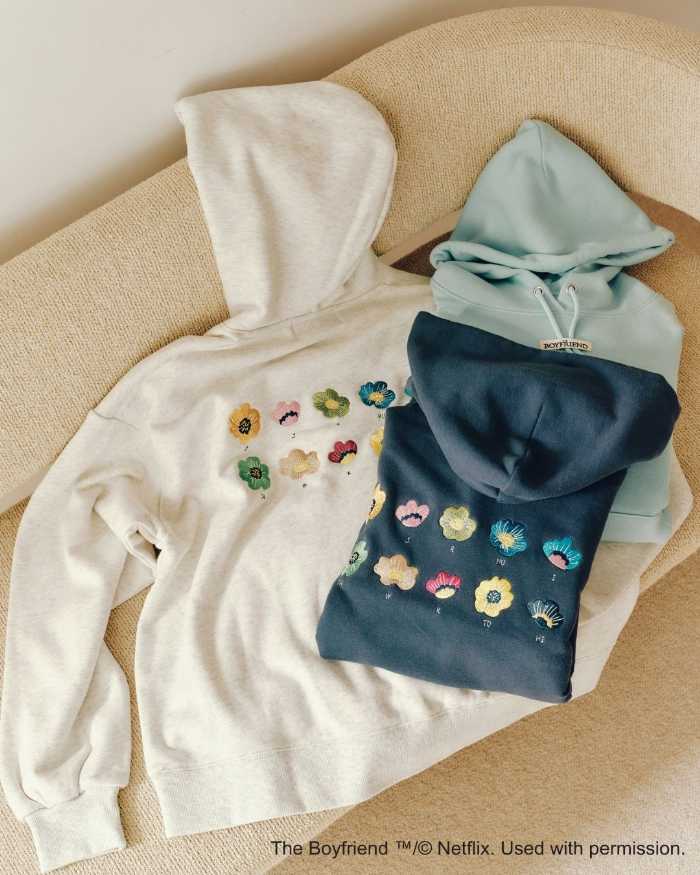 フラワープリントフーディ(グレー/ミント/ネイビー、M/L ¥6,600)や、アソートフラワーT(オフ/ネイビー、M/L ¥5,000)など、作品内で描かれた花や冬の北海道の情景を取り入れたアパレルアイテムがラインナップ。