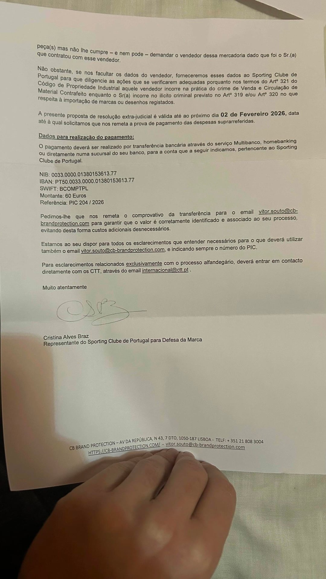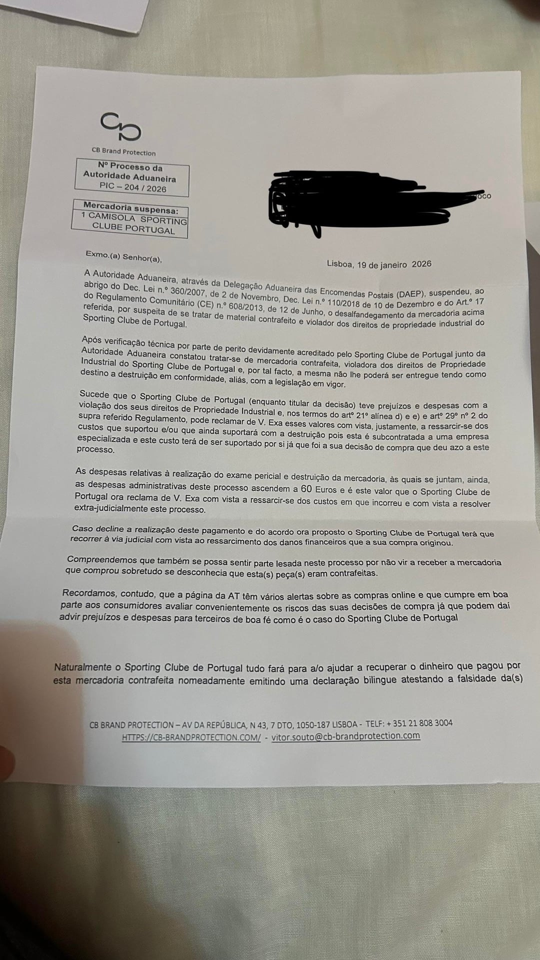 おやすみ皆さん! 11月にミスタートゥーガのセーターを注文しましたが、税関で引っかかってまだ届いていません。今日、私はSporting Clube de Portugalから偽造シャツを注文したとして60ユーロの罰金を要求する手紙を受け取り、Kappaからは同じ理由で85ユーロを要求する別の手紙を受け取りました。これを受け取ったことがありますか?詐欺ですか? Portugal