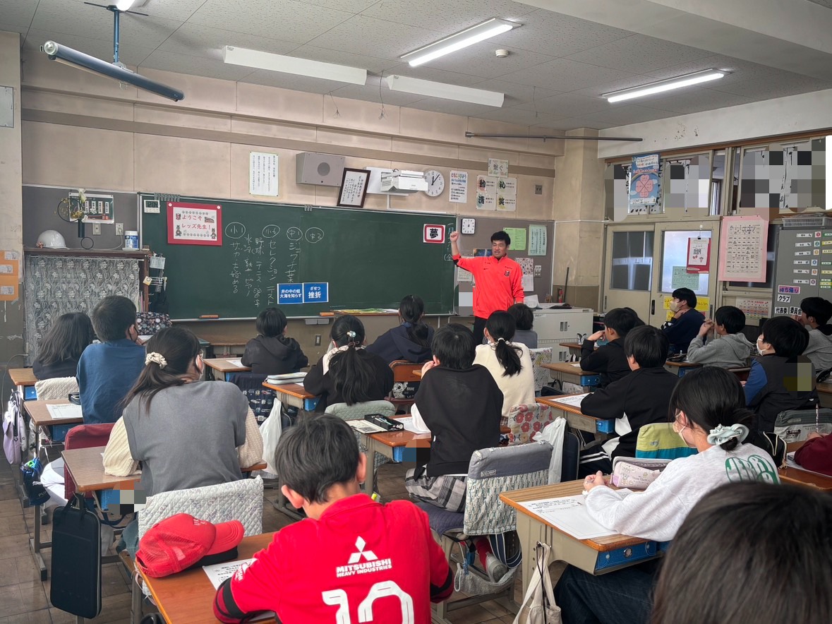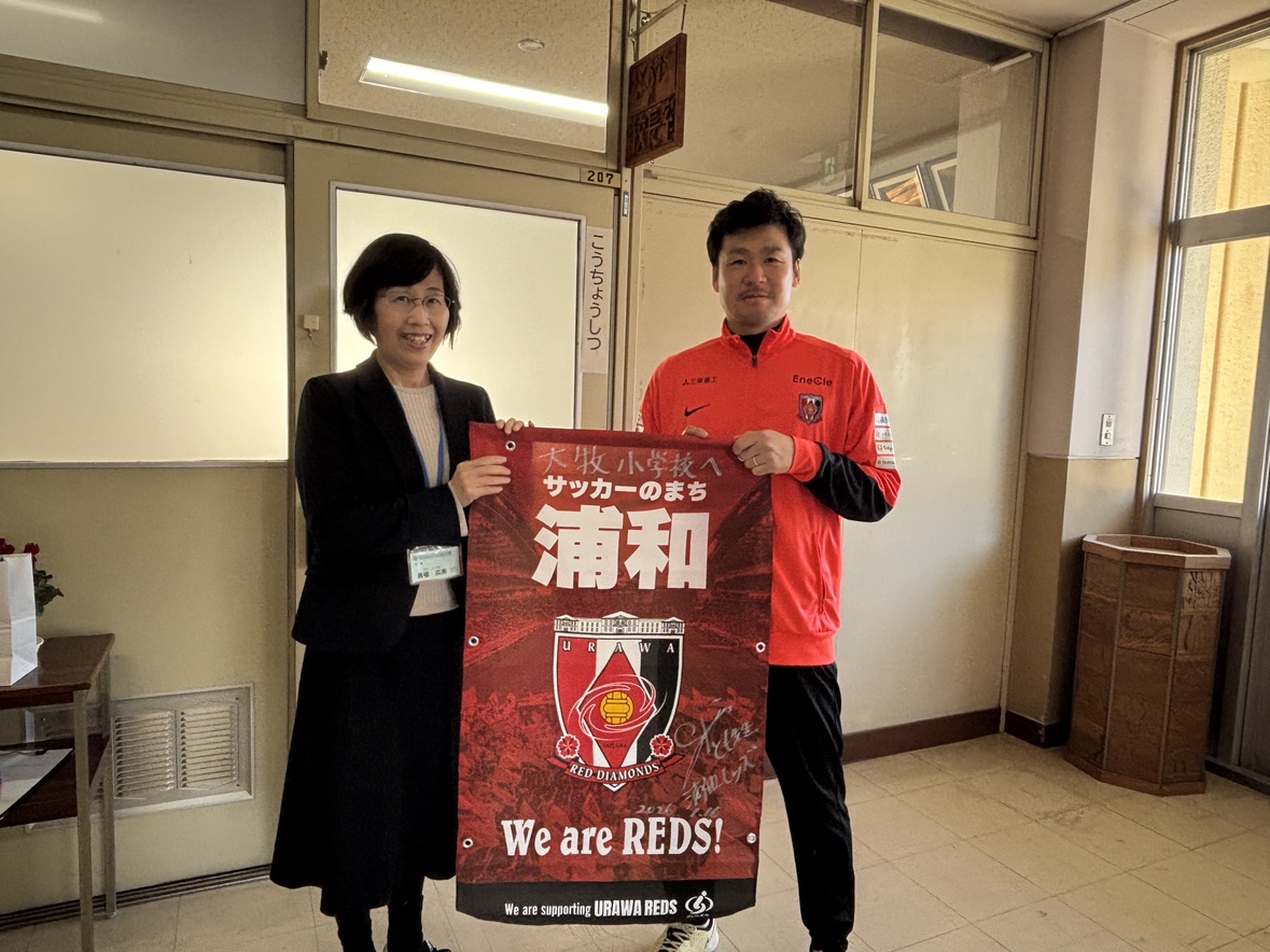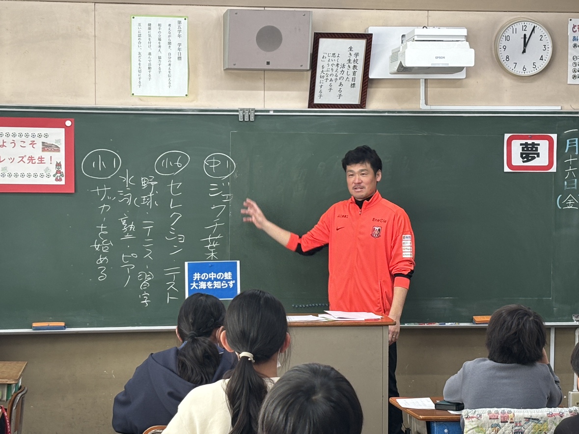 1月16日、ハートフルクラブコーチの酒井友之が緑区のさいたま市立大牧小学校を訪問し、「レッズ先生」として「夢」をテーマに5年生の児童に向けて授業を行った。