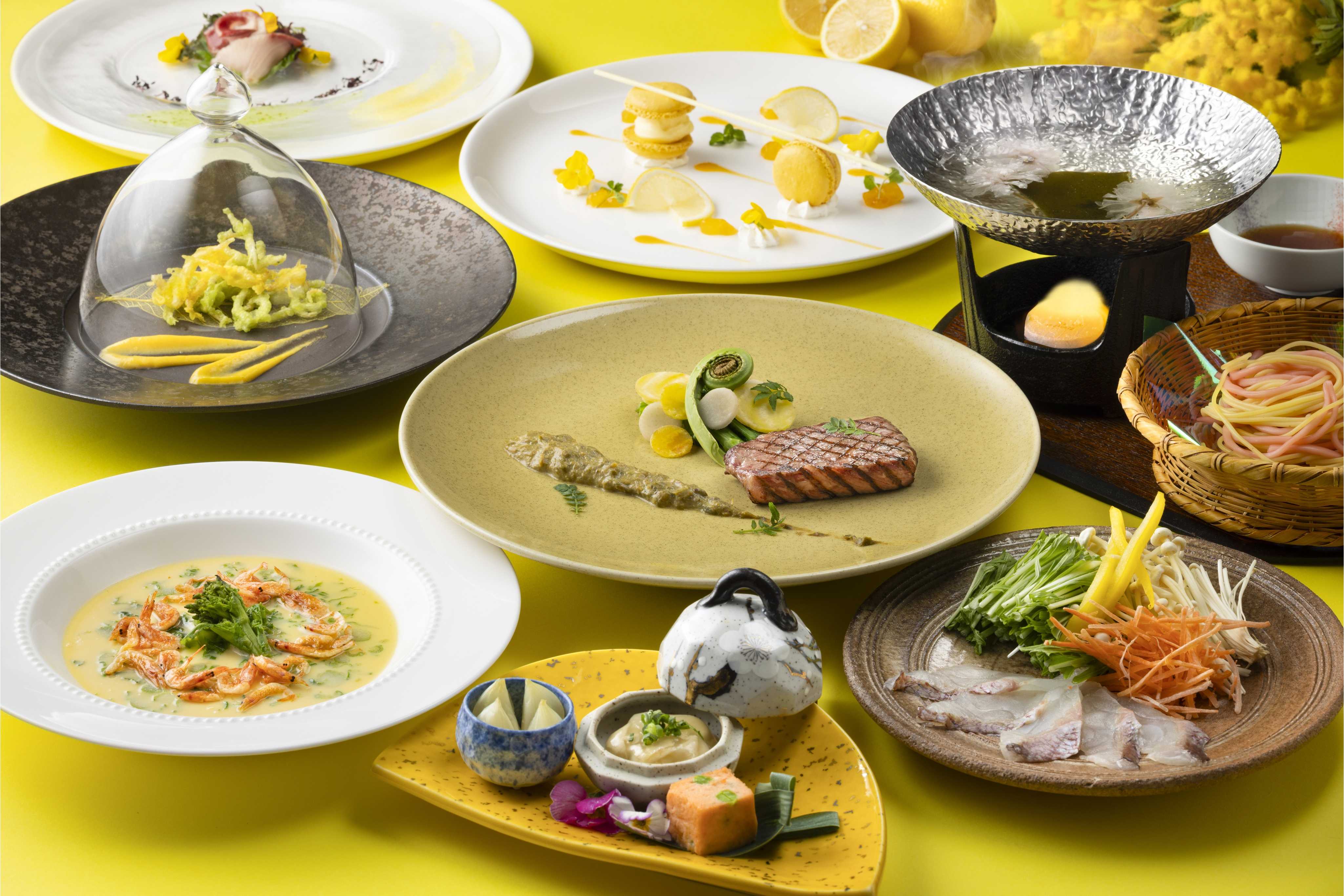 ジェンダー平等の実現を目指し、1975年に国連によって制定された国際女性デー。その象徴である黄色い花・ミモザに着想を得て、春の陽だまりを思わせるやわらかな黄色を基調に、山梨の恵みをふんだんに取り入れた全7品のディナーコースをご用意いたしました。白魚の二色揚げを忍野村産放牧卵の黄身酢で味わうアミューズや、甲斐サーモンや身延湯葉を用いた前菜三種が春の訪れを告げます。スープには、菜花と桜海老のフランを浮かべた、華やかな黄色の一杯をご用意。その後、旬魚のお造里に鳳梨と山椒の香りを添えた一皿に続き、メインはふきのとう味噌と山菜で春の力強さを表現した、甲州ワインビーフのサーロイングリルをお楽しみいただけます。締めも兼ねた魚料理は桜鯛のしゃぶしゃぶに、黄色の柚子麺とピンク色の桜麺、2色の春色麺を添え、彩りと香りの余韻を楽しむ一品をご提供。デザートのレモンマカロン「ミモザ・ジョーヌ」は、やさしい香りと色彩が調和し、季節の幸福感を五感でお楽しみいただけます。