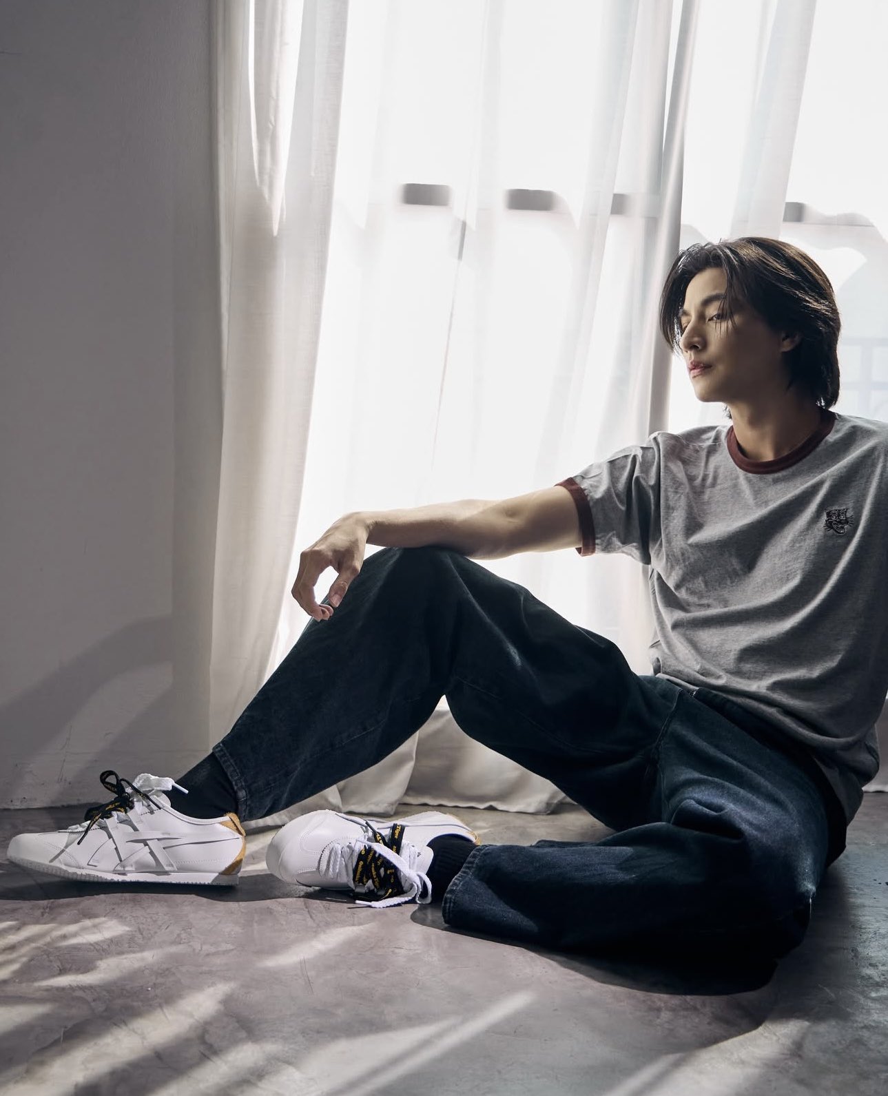 今回、彼の足元を彩るのは、ブランドのアイデンティティそのものである「MEXICO 66」。ホワイトをベースにゴールドとブラックのラインが映えるクラシックな一足を、あえてルーズなシルエットのワイドデニムに合わせることで、2026年のトレンドを象徴するような抜け感のあるアーバンスタイルを構築しています。トップスのグレーのリンガーTシャツには、胸元に象徴的なタイガーの刺繍が施され、カジュアルさの中に品格を添えているのが印象的です。