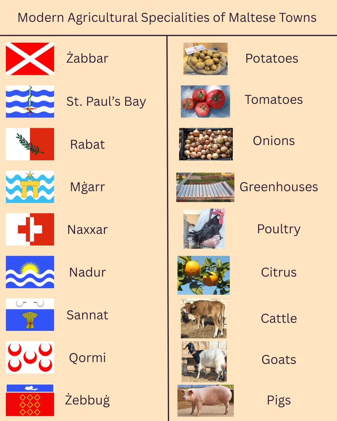 現在のマルタ全土でさまざまな作物や家畜が最も一般的に見られる場所のスナップショット。歴史的伝統ではなく、現在の農業の存在のみに基づいています。