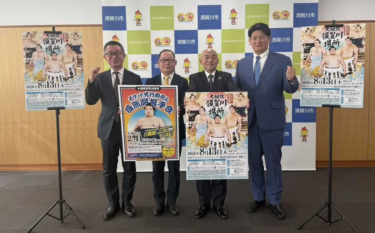 吉本興業株式会社と株式会社LIVE FORWARDは2日、8月13日に福島県須賀川市の円谷幸吉メモリアルアリーナで「令和8年夏巡業 大相撲須賀川場所」を開催すると発表した。須賀川市では2009年以来17年ぶりの開催。豊昇龍(26=立浪部屋)、大の里(25=二所ノ関部屋)の両横綱、初場所で2場所連続優勝を果たした大関・安青錦(21=安治川部屋)、大関・琴桜(28=佐渡ケ嶽部屋)に加えて同市初の大相撲力士である十両・白熊(26=二所ノ関部屋)ら約200人が参加を予定している。