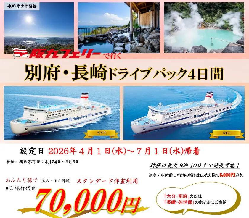 ヴィーナストラベルは、阪九フェリー利用の「別府・長崎ドライブパック4日間」を発売した。対象の旅行期間は4月1日~7月1日帰着分(4月24日~5月6日を除く)。