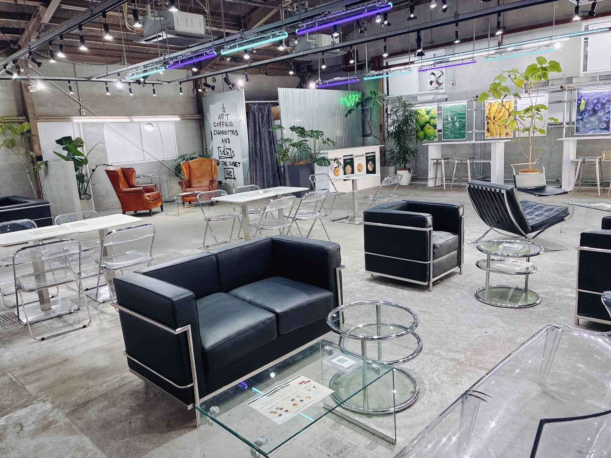 店内に入ると、コンクリート打ちっぱなしの床にネオンサインが輝く、韓国カフェのようなおしゃれな空間が広がります。倉庫をリノベーションしているため天井が高く、開放感は抜群。ゆったりとしたソファ席や透明なチェアなど、インテリアの一つひとつにこだわりが感じられます。ちなみに、こちらはワンちゃん連れもOKなんですよ。