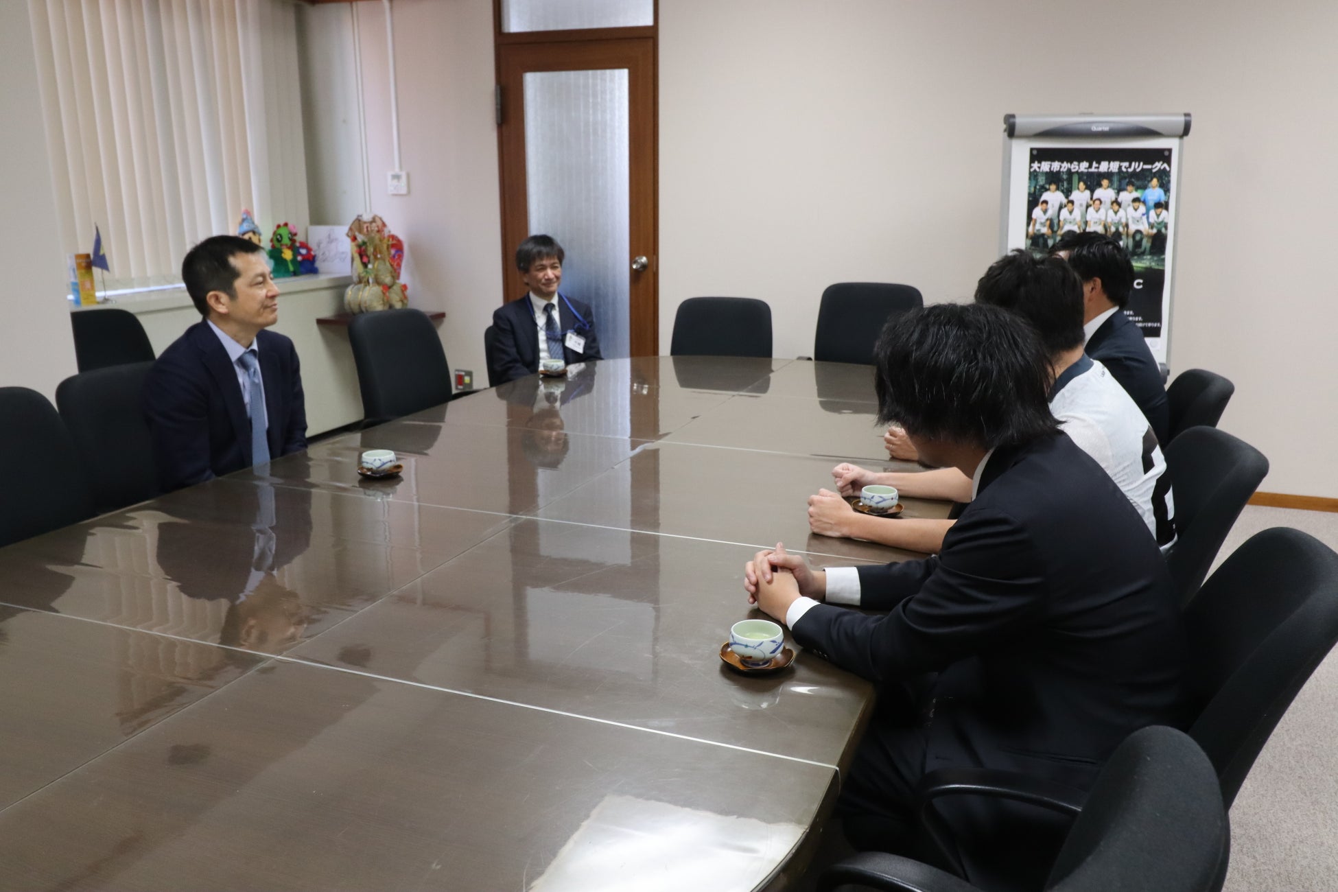 このたびOsaka City SCは、関西サッカーリーグDivision2への昇格決定を報告するため、大阪市中央区役所 松田彰久区長への表敬訪問を行いました。