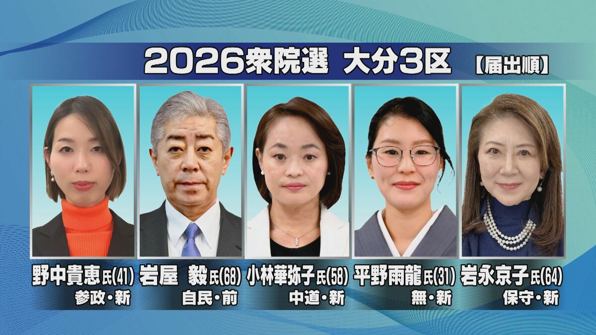 大分3区には前職と新人4人の合わせて5人が立候補しています。