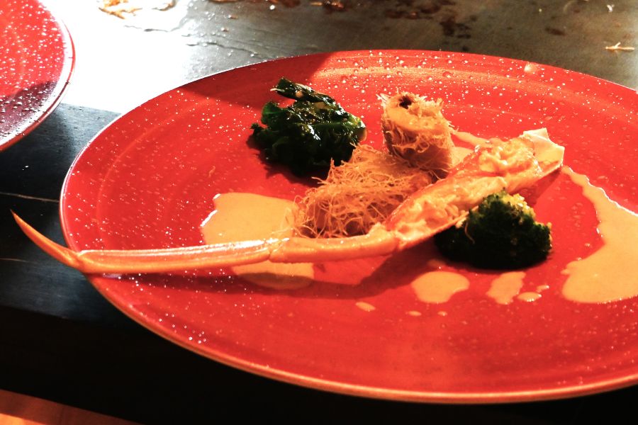 「鳥取県産松葉蟹ソテー とうふちくわのカダイフ巻き オリエンタルソース」ヒルトン大阪の鉄板焼コースより