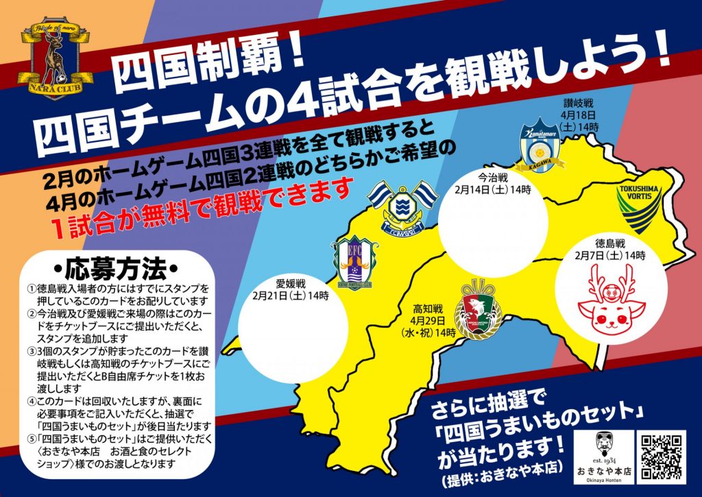 このたび、明治安田J2・J3百年構想リーグで行われる四国5クラブ(2/7 徳島ヴォルティス戦、2/14 FC今治戦、2/21 愛媛FC戦、4/18 カマタマーレ讃岐戦、4/29 高知ユナイテッドSC戦)とのホームゲームを対象に「四国制覇!四国チームの4試合観戦しよう!スタンプラリー」を実施いたします。