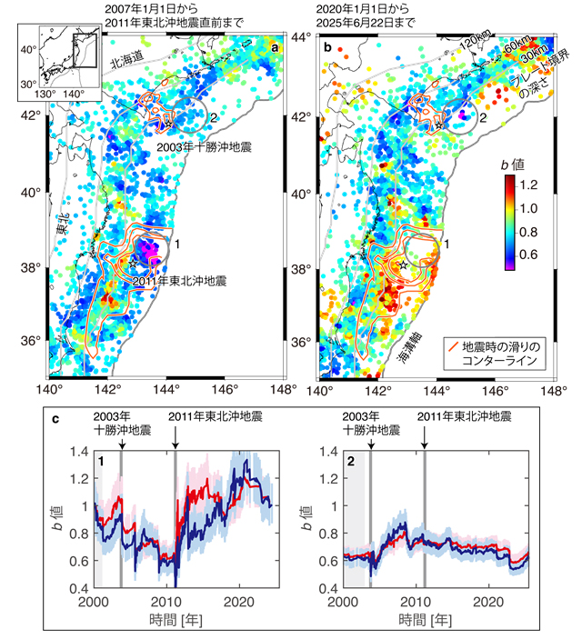 (a)2011年東北沖地震直前の地震活動(M≥2.8)に基づき計算したb値の空間分布を示す。星印は2011年東北沖地震と2003年十勝沖地震の震央(破壊開始点)を示す。オレンジ色のコンターラインは両地震時の滑り量を示す。挿入図は研究領域を示す。図中の1および2で示す領域内で起きた地震を用いて、(c)のb値の時間変化を計算した。(b)現在のb値の空間分布を示す。(c)左図は領域1におけるb値の時間変化(赤: M≥2.8、青: M≥2.5)を示す。灰色の縦線は東北沖地震と十勝沖地震の発生時刻を示す。灰色の帯はb値算出に用いた地震数が少なく、信頼性が低い期間を示す。右図は領域2におけるb値の時間変化を示す。