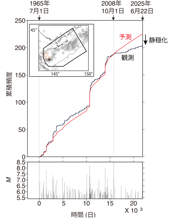 上図: 黒曲線は北海道沖の地震(M≥5.7)について累積頻度を時間の関数でプロットしたもの。挿入図に示すポリゴン内で、1965-2025年に起きた地震を用いた。ETAS(イータス)と呼ばれる地震活動モデル(赤曲線)を用いて、1965-2008年の地震活動を学習し、それ以降を予測した。地震活動の特徴に変化が無ければ、赤(予測)と黒(観測)は概ね重なるが、2008年以降は黒曲線が赤曲線より下側にあり、地震活動が低調となり静穏化が起きていることを示す。静穏化は世界の大地震発生前にしばしば観測される現象であり、M9超巨大地震(図3b)の震源域となる可能性ある北海道沖でこうした静穏化が起きていることを示している。下図: 使用した地震のMと地震の起きた時間の関係を示す。