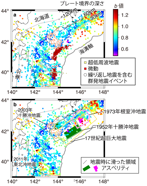 (a)北海道沖のb値の低い地域を避けてスロー地震(超低周波地震、微動、繰り返し地震を含む群発地震イベント)が分布していることがわかる。先行研究では、2011年東北沖地震の大滑り域やM7~8クラスの大地震を避けてスロー地震が発生していることが示されており、本図でも2003年十勝沖地震の大滑り域を避けてスロー地震が起きていることから、b値の低い地域は大規模地震の大滑り域になり得る可能性を示唆する。(b)M8クラスの2003年十勝沖地震(オレンジ色)、1973年根室沖地震(ピンク色)の間の「空白域」でb値が低い。この空白域では、これらのM8クラス地震の前に別のM8クラスの1952年十勝沖地震(緑色)が発生しており、「地震が起きない地域」ではなく、「大地震をまだ起こしていないが、大きな力がかかっており、大地震が近づいている」と考えられる未破壊域と言える。また、17世紀に起きたとされるM9クラスの超巨大地震の震源域(黄色)と重なる海域でb値が低いこともわかる。国の長期評価により、17世紀北海道超巨大地震の再来可能性が指摘されている中で、b値の低下、と「静穏化」、「空白域」、「スロー地震の活動」(図1b, 2と本図)が進行中であり、そして測地学的研究にから明らかになった強いプレート固着が同時に進行していることは、大地震発生のサインを複数の観点から確認したことを意味する。