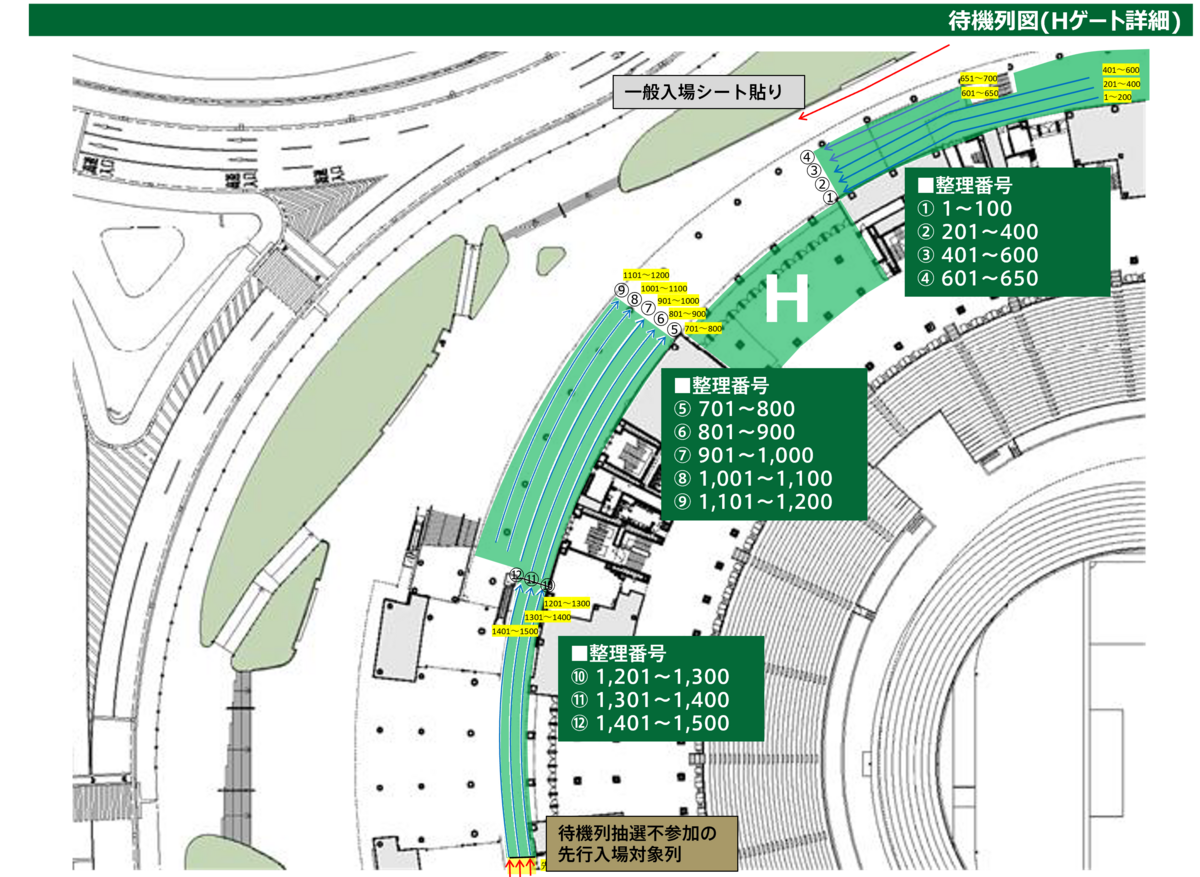 ・Hゲートの入場待機列解消後は、各お手持ちのチケットに記載された入場ゲートからのご入場となります。