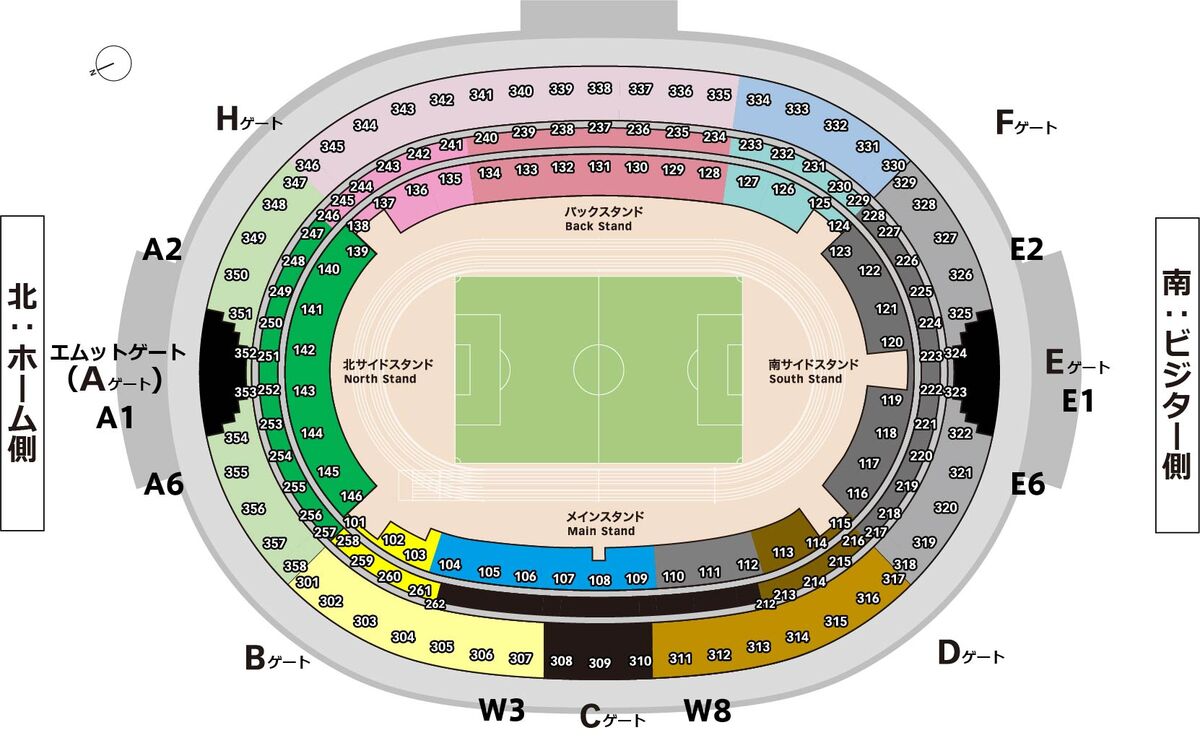 ・ホームエリアで観戦される方対象の『Hゲート』『A1ゲート』『W3ゲート』『A2ゲート』『A6ゲート』は、ビジターチームのユニフォームの着用・応援グッズを身に着けての入場はできません。