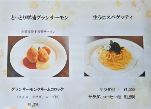 さらに、「生うにスパゲッティ(サラダ・コーヒー付)」など、海の幸を楽しめるパスタメニューも揃っています。