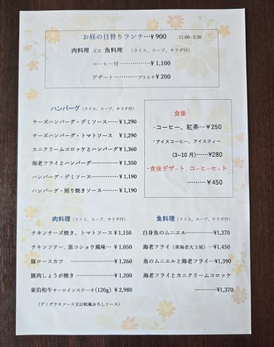 その他、メインを肉か魚から選べる日替わりランチ (11:00~14:30までオーダー可)をはじめ、ハンバーグや肉料理、魚料理からも選べます。