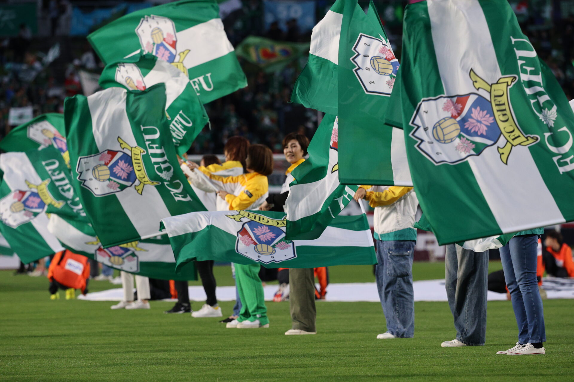 ピッチの中でマッチョがお出迎え!応援フラッグをなびかせ、選手にパワーを送ろう!