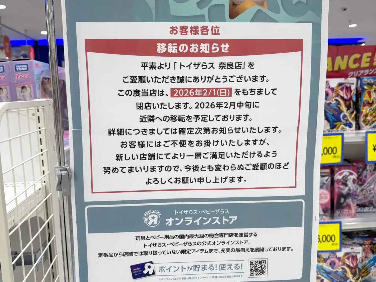 2月1日にミ・ナーラ3Fにあるトイザらス奈良店が営業を終了し、2月中旬に近隣に移転オープンすることが予告されていたばかりでした。