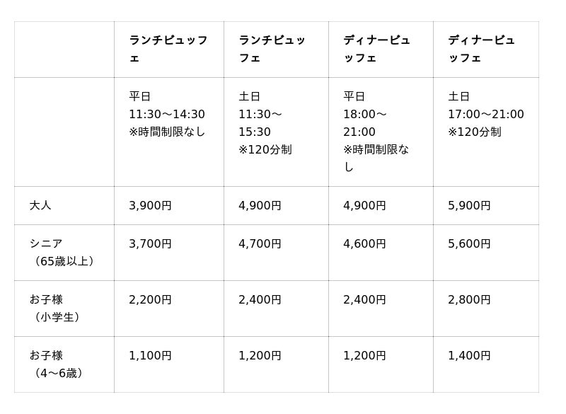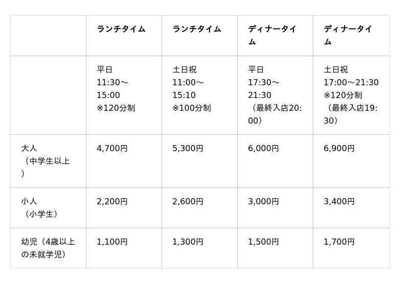 大人6,500円~、シニア(65歳以上)5,700円~、お子様(小学生)3,500円~、幼児(4~6歳)2,300円~
