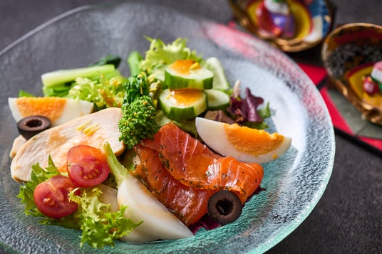 一品料理3種 / メイプルサーモン サラダ仕立て じゅうねん味噌ドレッシング 2,800円 他