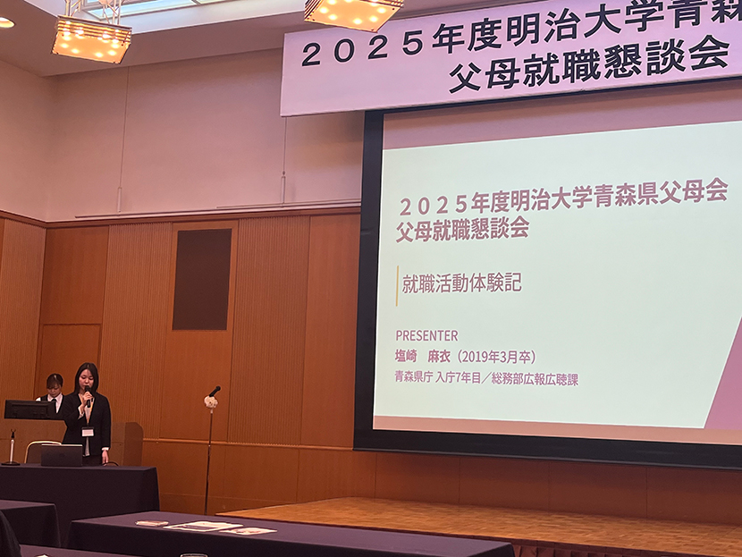 2019年3月農学部 食料環境政策学科を卒業され、青森県総務部広報広聴課に勤務する塩崎 麻衣さんからは、大学在学中の中国山東省や長崎五島列島での課外活動の写真、県庁を目指した理由、就職活動で民間企業との比較、2年生から公務員を目指し公務員の専門学校に通い勉強していた。また、明大生の強みなどについても話してくれました。入庁7年になるが、それぞれの部署での自身のスキルアップを自己分析するなど、仕事にやりがいを感じているようでした。最後に、親は子供の「行動と決断を信じて見守る姿勢」が大切であると話されていました。お二人とも貴重な発表内容で、父母の皆さんは、熱心に耳を傾けていました。