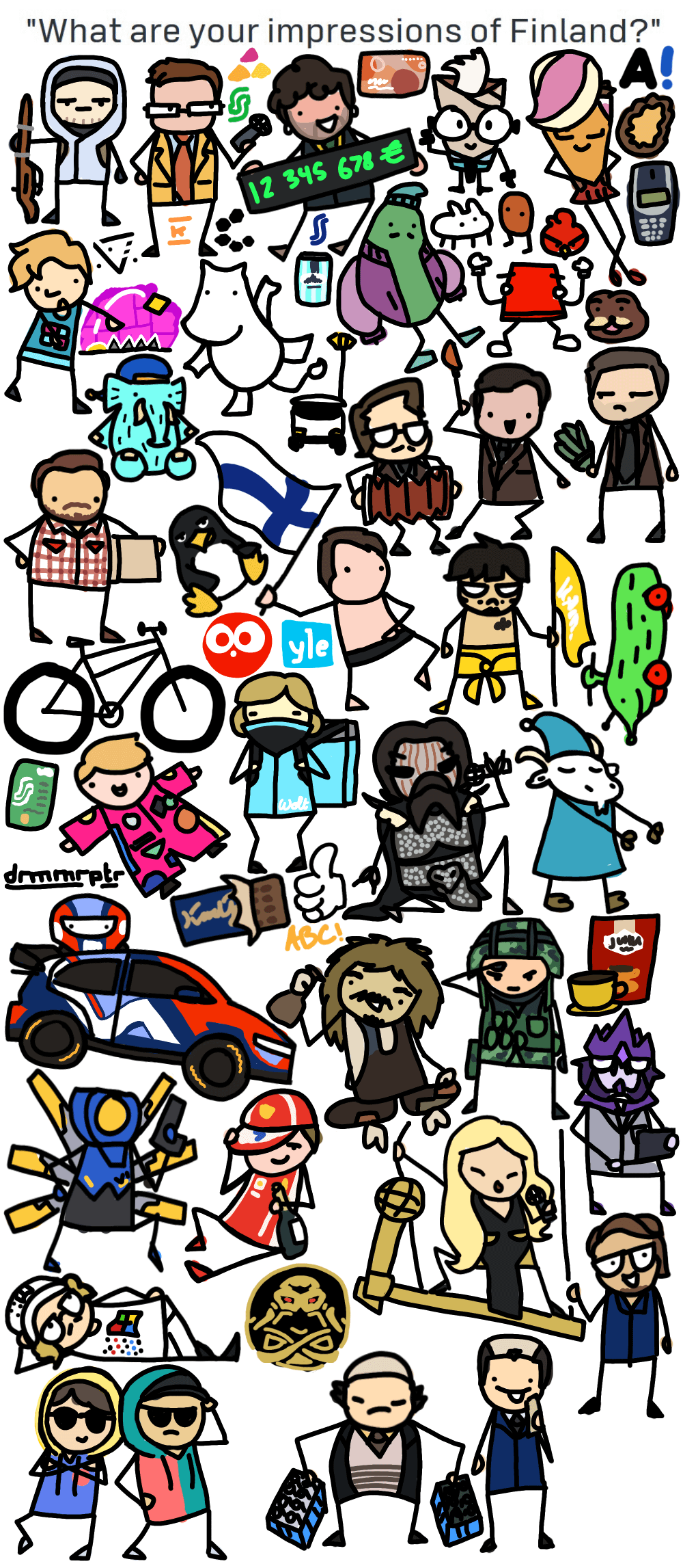 K-Plussaカード、カレリアンパイ、Sマーケット、ノキア(3310モデル)、あのバカなクマのやつ:DDDD、触手(?)、トクマンニさん、タックスペンギン、 "市場へ" 男、カーリヤ、クルクモボ、ウォルト・クーリエとファットタイヤ・バイク、ミスター・ローディ、ミスター・クラッターバック、S-エトゥコルッティ、斑点のあるオーバーオールを着た学生、カール・ファザーのチョコレートバー、ABCガソリンスタンドとダイナー、ラリーカー、レーリ、フィンランド軍服、ユーラ・モッカ、V1、キミ・ライコネン、エリカ・ヴィクマン、パーヴォシリヤマキ(全然似てない😭)とクンメリ