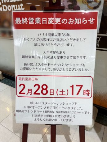 フレンドマート開発店にミスドが4月にできるみたい。パリオのミスドは2/28(土)までだそう。