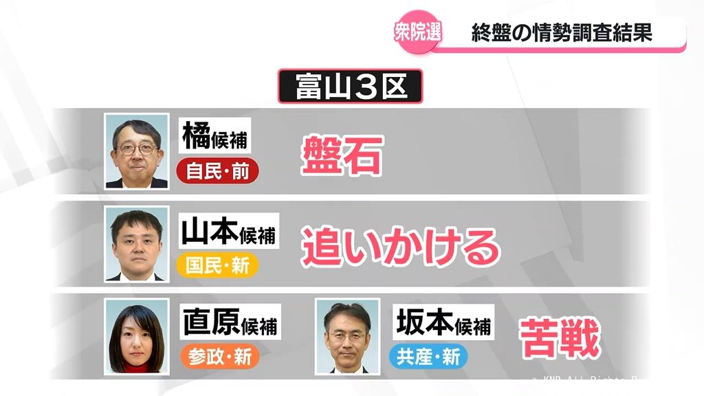 4人が立候補している富山3区は、自民党・前職の橘慶一郎候補が依然、盤石の戦いです。