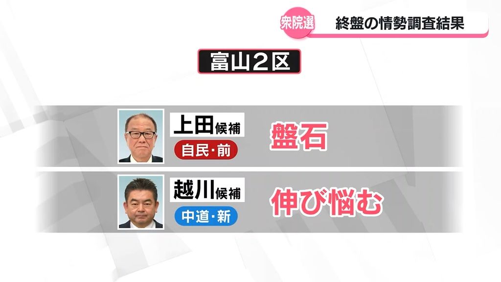 一騎打ちとなっている富山2区は、自民党・前職の上田英俊候補がリードを広げて盤石な態勢となっています。
