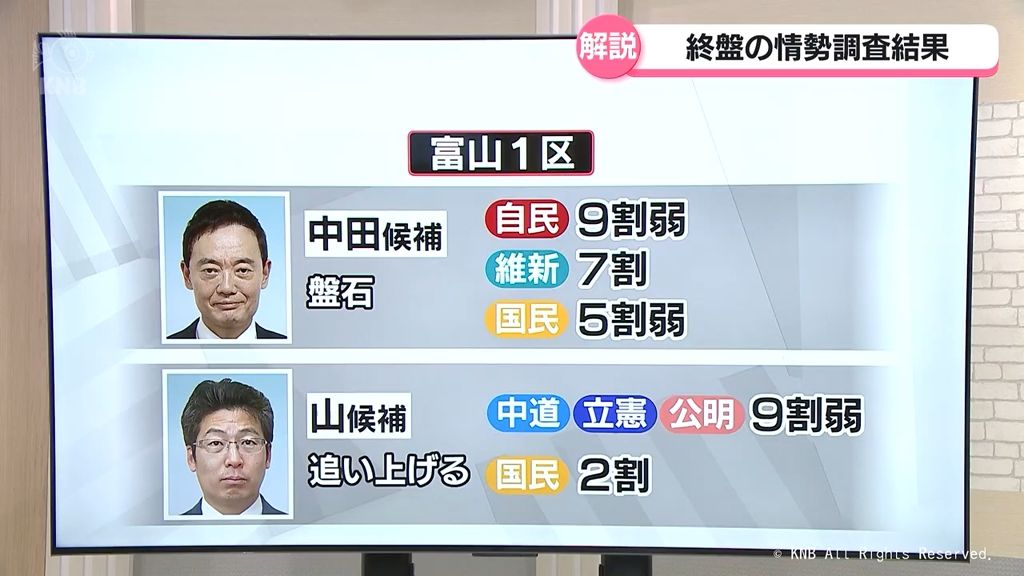 その結果、4人が立候補している富山1区は、自民党・元職の中田宏候補が選挙戦序盤よりリードを広げて盤石な態勢を固めつつあります。