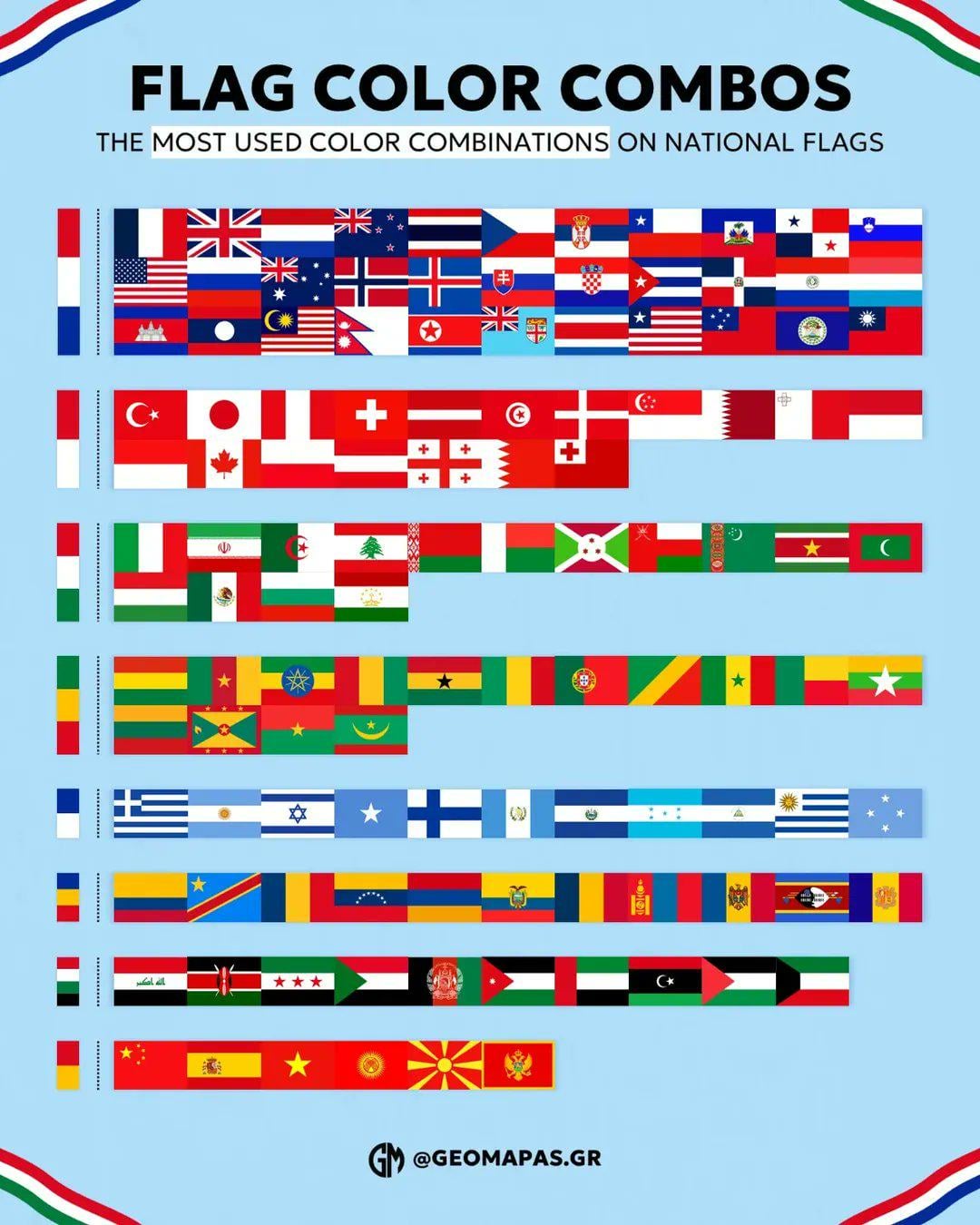 国旗で最もよく使われる色の組み合わせ。
