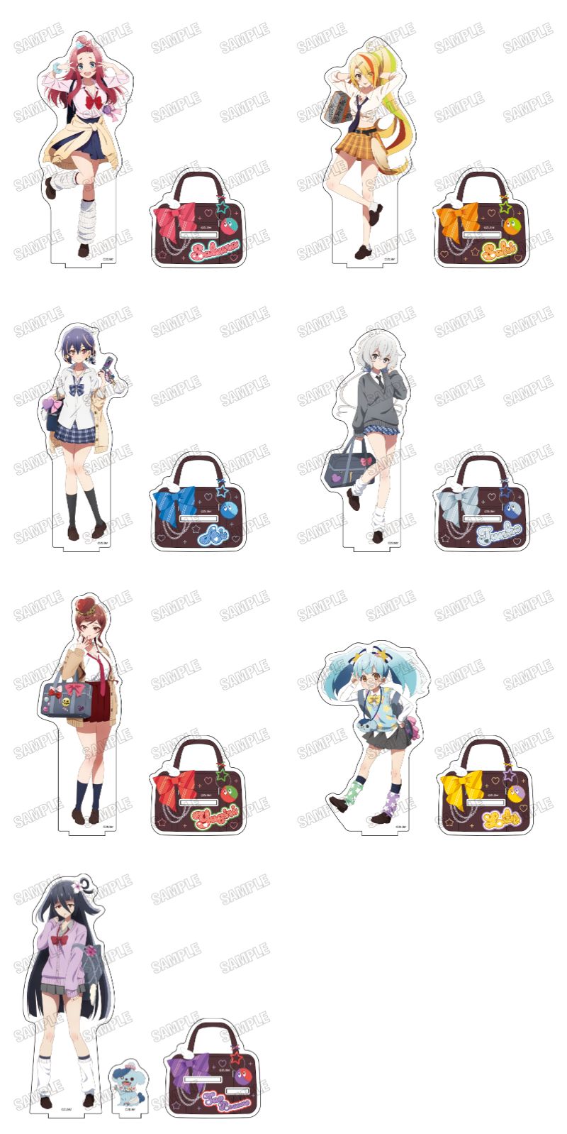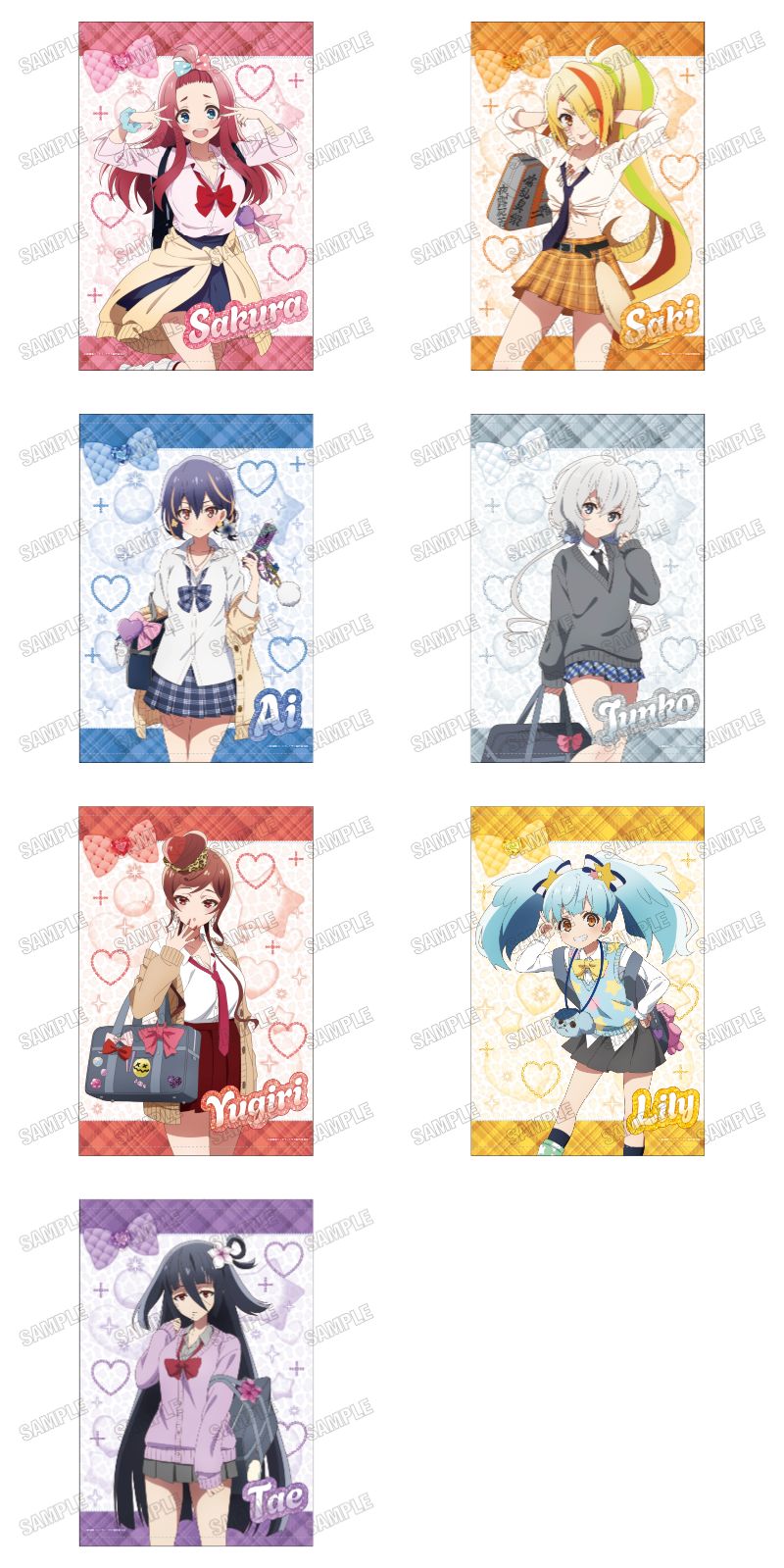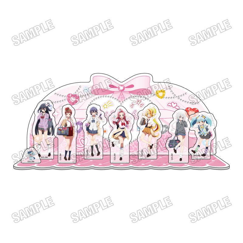 さくら、サキ、愛、純子、ゆうぎり、リリィ、たえらフランシュシュのメンバー7人を描いた「缶バッジコレクション」や「BIGアクリルスタンド」など全9種がラインナップ。