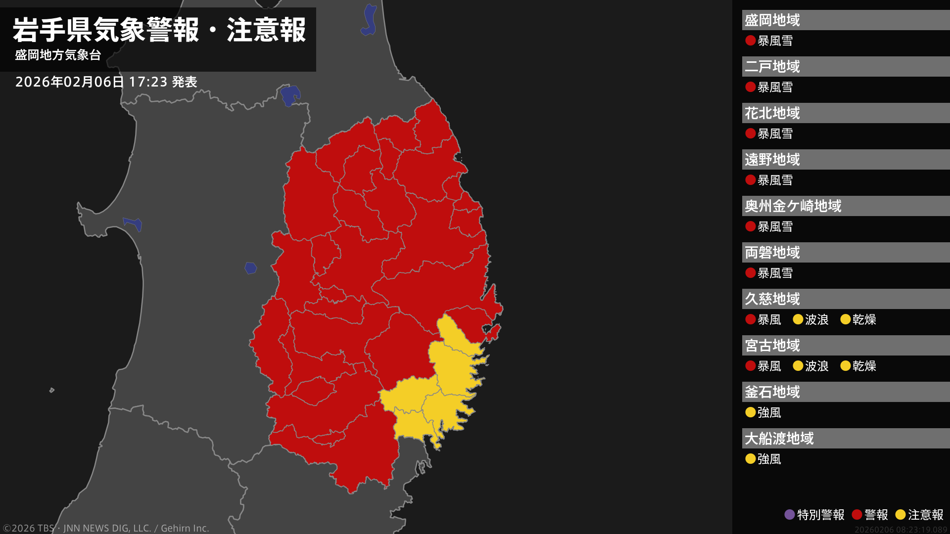 気象台は、午後5時23分に、暴風雪警報を盛岡市、花巻市、北上市、遠野市、一関市、二戸市、八幡平市、奥州市、滝沢市、雫石町、葛巻町、岩手町、紫波町、矢巾町、西和賀町、金ケ崎町、平泉町、軽米町、九戸村、一戸町に発表しました。