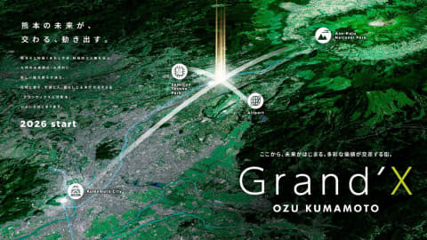 Grand’X 大津熊本は、半導体産業の集積地に程近い大津町の約6.5haの敷地における複合開発事業。阿蘇くまもと空港からのアクセスが良好な計画地において、人・モノ・文化・情報が交わる複合拠点としての役割と可能性を表現するプロジェクト名称とした。