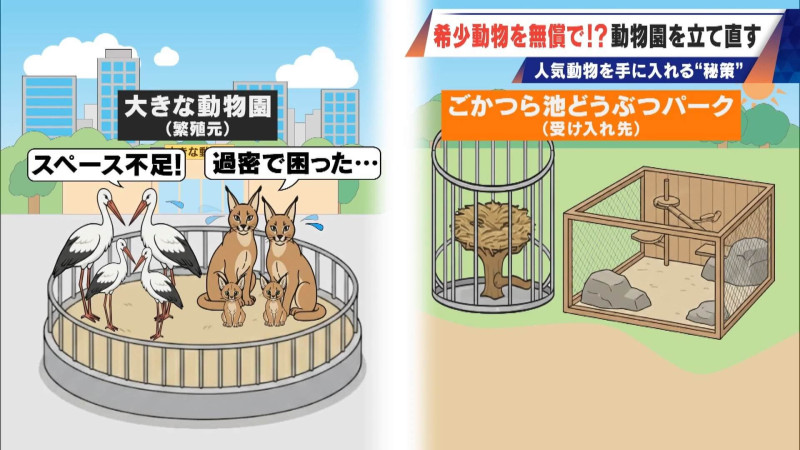 繁殖を進める際、動物が増えて飼育スペースが足りなくなる問題に目を付け、増えた個体の受け入れ先となることで、貸し出し元の動物園は飼育スペースを、一方ごかつら池は新しい動物をそれぞれ得ることになり、WIN-WINの関係となるのです。