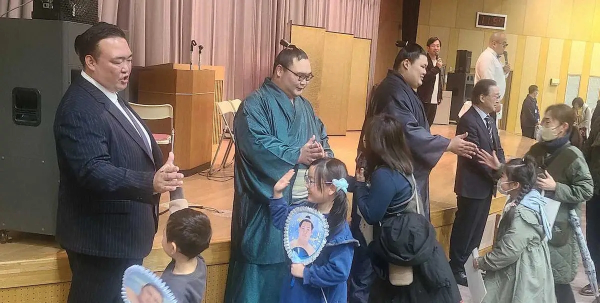 大相撲の二所ノ関部屋が7日、部屋を構える茨城県阿見町で交流イベント「町民報告会」を開いた。昨年に次いで2度目の開催で二所ノ関親方(元横綱・稀勢の里)、横綱・大の里(25)、十両・白熊(26)が出席。冒頭で千葉繁町長から「部屋を構えて3年で横綱が誕生。これも師匠のご指導のたまもの。阿見には神様が2人います。横綱・稀勢の里と大の里です」と祝辞を受け、二所ノ関親方は「昨年は横綱昇進、優勝も3回。いい年でした」とあいさつ。集まった町民約470人の拍手を受けた。