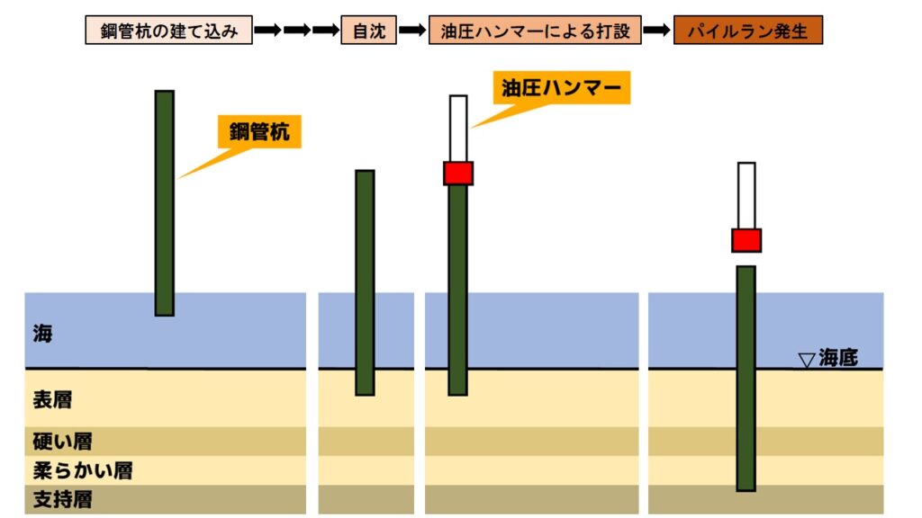 打設位置に鋼管杭を建て込んで海底地盤に下げていくと自重で表層に沈み込む、これを自沈と言いますが、そのあと油圧ハンマーで打ち下げていく時に支持層より上に自沈するような柔らかい層がある場合、硬い層を油圧ハンマーによる打撃で打ち抜くと鋼管杭が柔らかい層を自沈して地盤の中を落下していく現象が起こる、これがパイルラン。鋼管杭が制御出来ない状態になるので非常に危険な現象といえる。