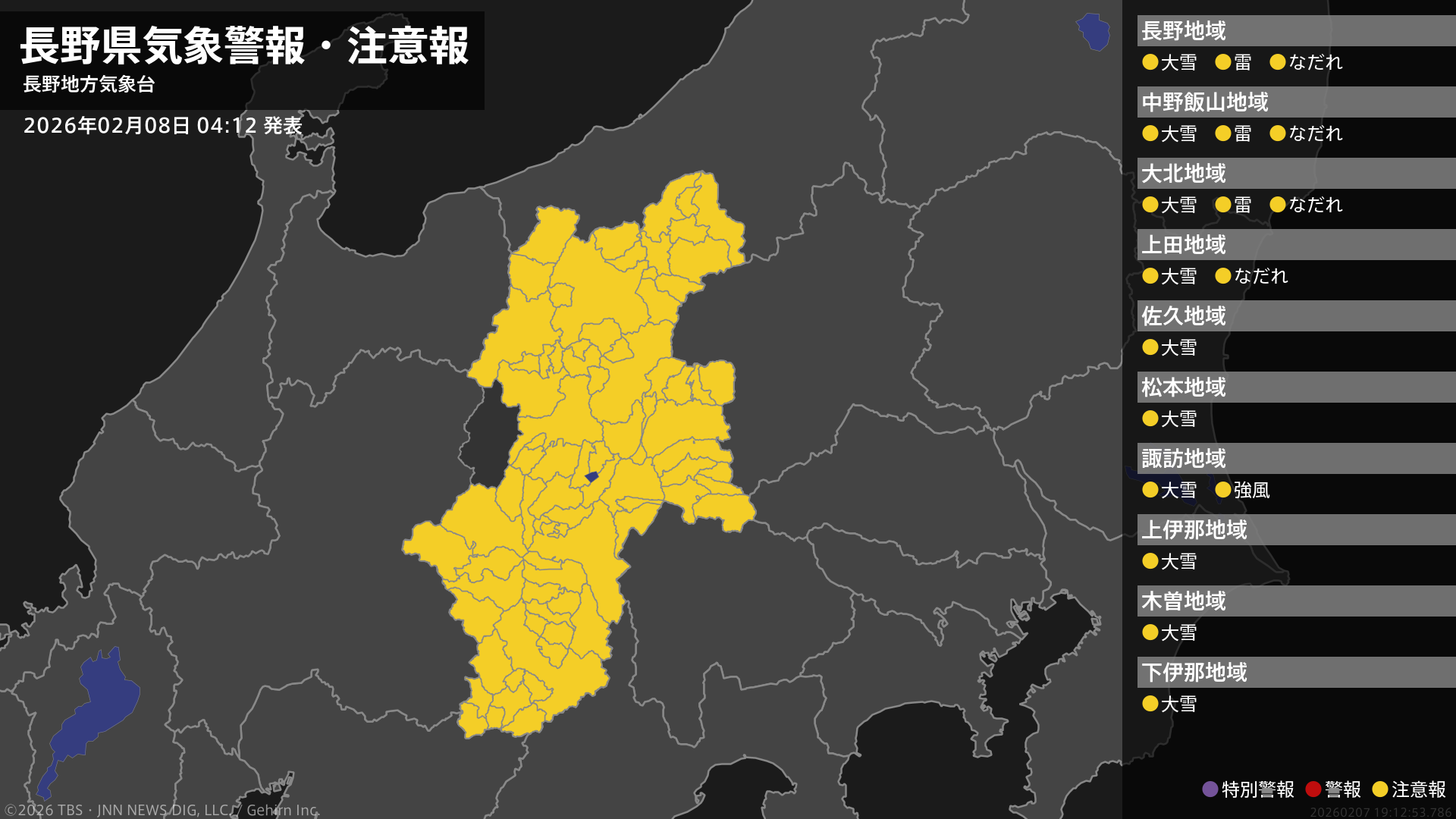 気象台は、午前4時12分に、なだれ注意報を長野市、上田市、中野市、大町市、飯山市、白馬村、小谷村、高山村、山ノ内町、木島平村、野沢温泉村、信濃町、小川村、飯綱町、栄村に発表しました。