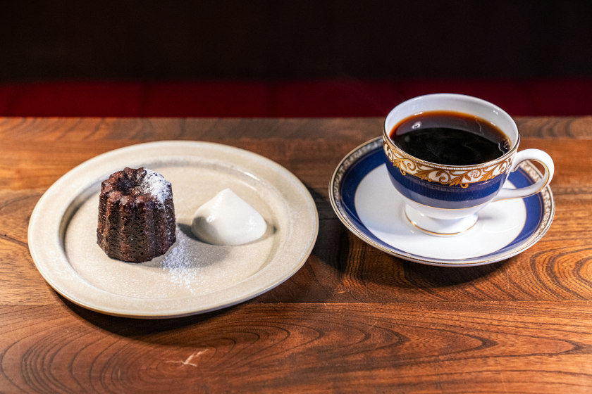 多層的なアロマが心地良いブレンド「メメント」600円。名田庄の蜜蝋(みつろう)を使った「カヌレ」400円はこっくりと上品な甘さ