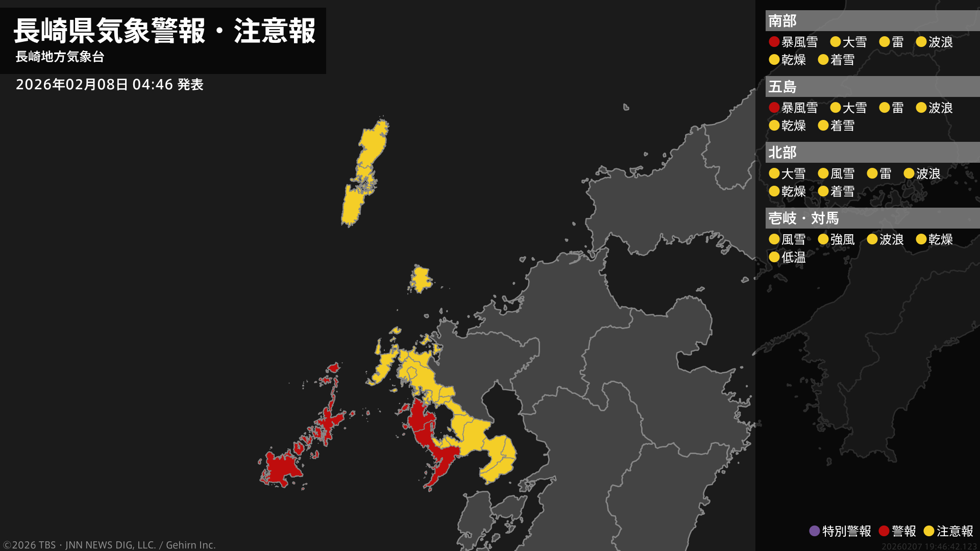 【暴風雪警報】長崎県・長崎市、佐世保市(宇久地域)、五島市、西海市(江島・平島を除く)、西海市(江島・平島)、小値賀町などに発表 8日04:46時点