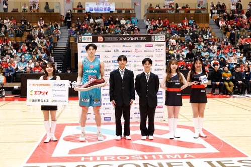 備後企業連合 presents MOM賞は、三谷桂司朗 選手が受賞しました。銀河学院中・高等学校 生徒会 高校2年生 上野志優 様、杉野公紀 様より、ニチマングループ・株式会社スピングルカンパニー様から広島を代表するハンドメイドスニーカー スピングルが贈呈されました。