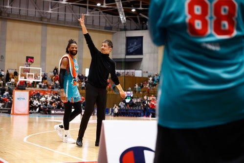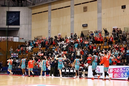 広島ドラゴンフライズは、熱い戦いを繰り広げてくれたアウェイチームへリスペクトを込めて、スタンディングオベーションでお送りしています。