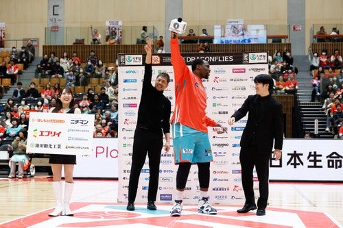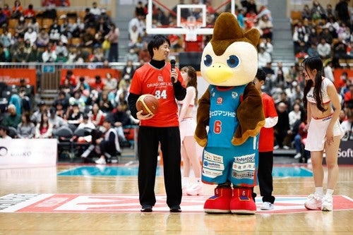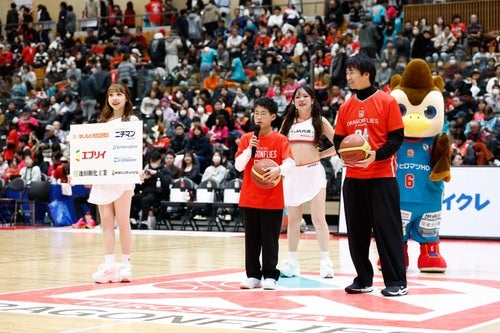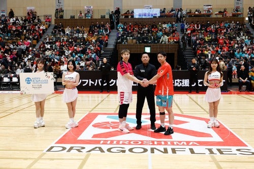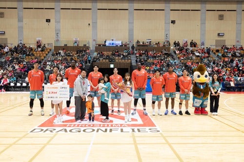 試合開始前には、両チームのキャプテンによるおりづる交換が行われました。試合を通して最もリスペクトに値する選手を表彰する「ヒロマツホールディングス presents おりづる賞」は、広島ドラゴンフライズ 山崎稜 選手、秋田ノーザンハピネッツ 小川瑛次郎 選手が受賞しました。