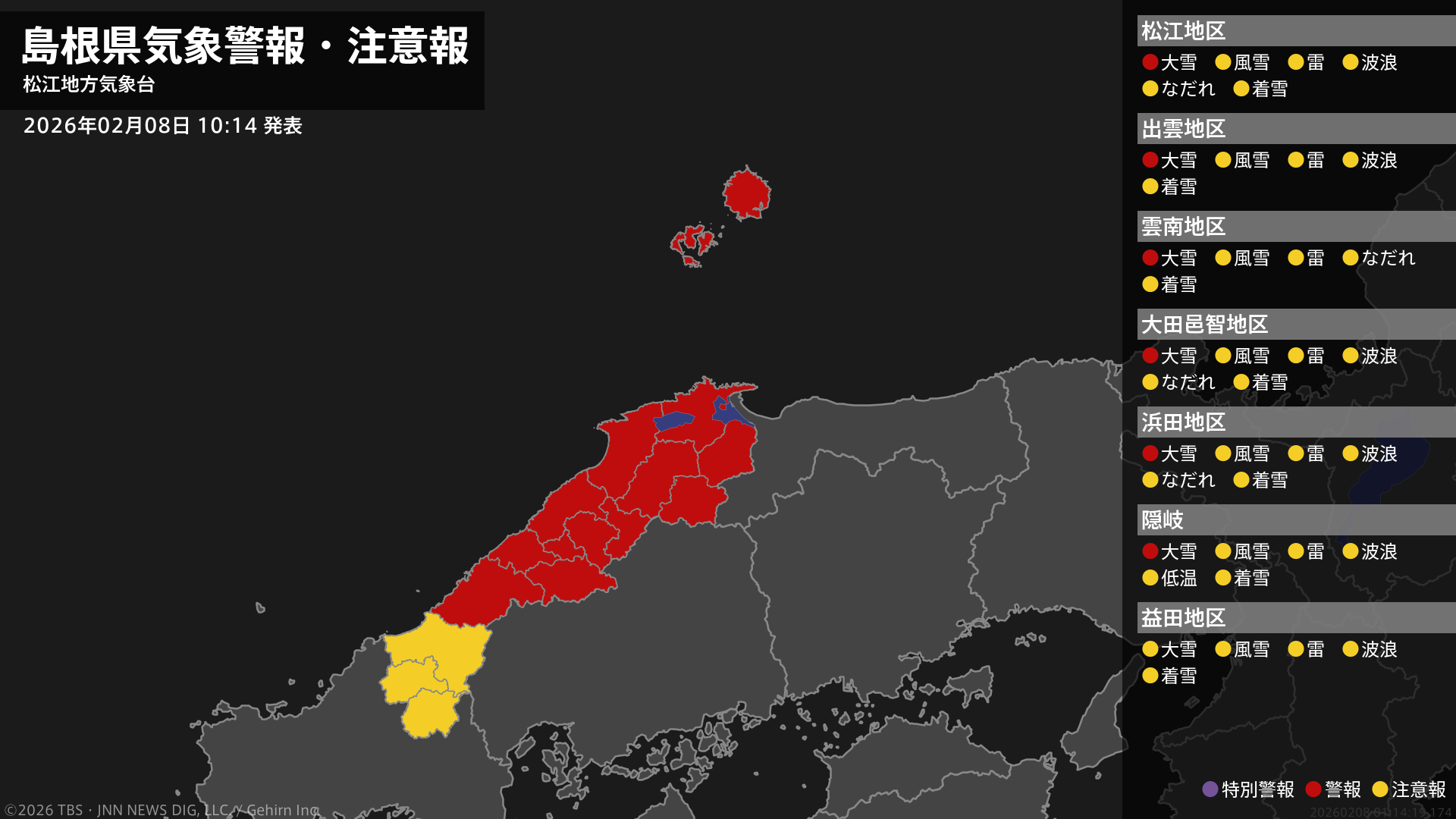 気象台は、午前10時14分に、なだれ注意報を松江市、雲南市、邑南町に発表しました。