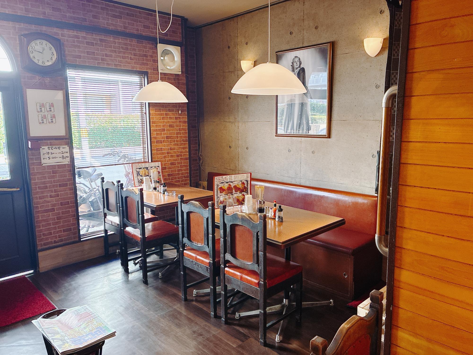 店内に入ると、レンガ調の壁や赤いソファ席があり、どこか懐かしい喫茶店のような落ち着いた雰囲気が漂っています。ペンダントライトの温かい光に包まれながら、ゆったりと食事を楽しむことができます。