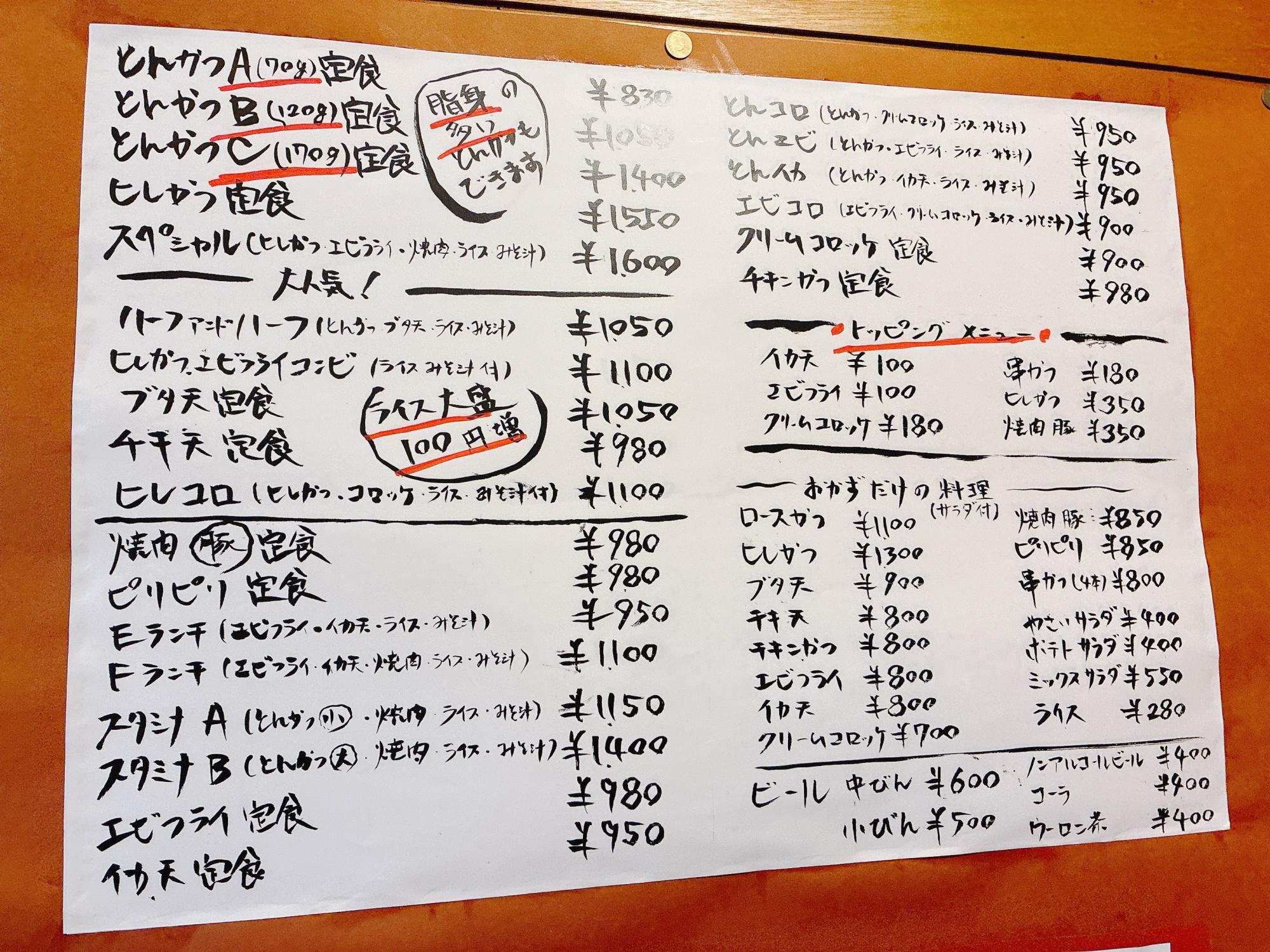 こちらがメニューです。独特の筆文字で書かれたメニューには、とんかつをはじめ、エビフライやクリームコロッケなど、魅力的な洋食メニューがずらり。中でも目を引くのが、お店の名物である「ブタ天」と「とんかつ」がセットになったメニューです。