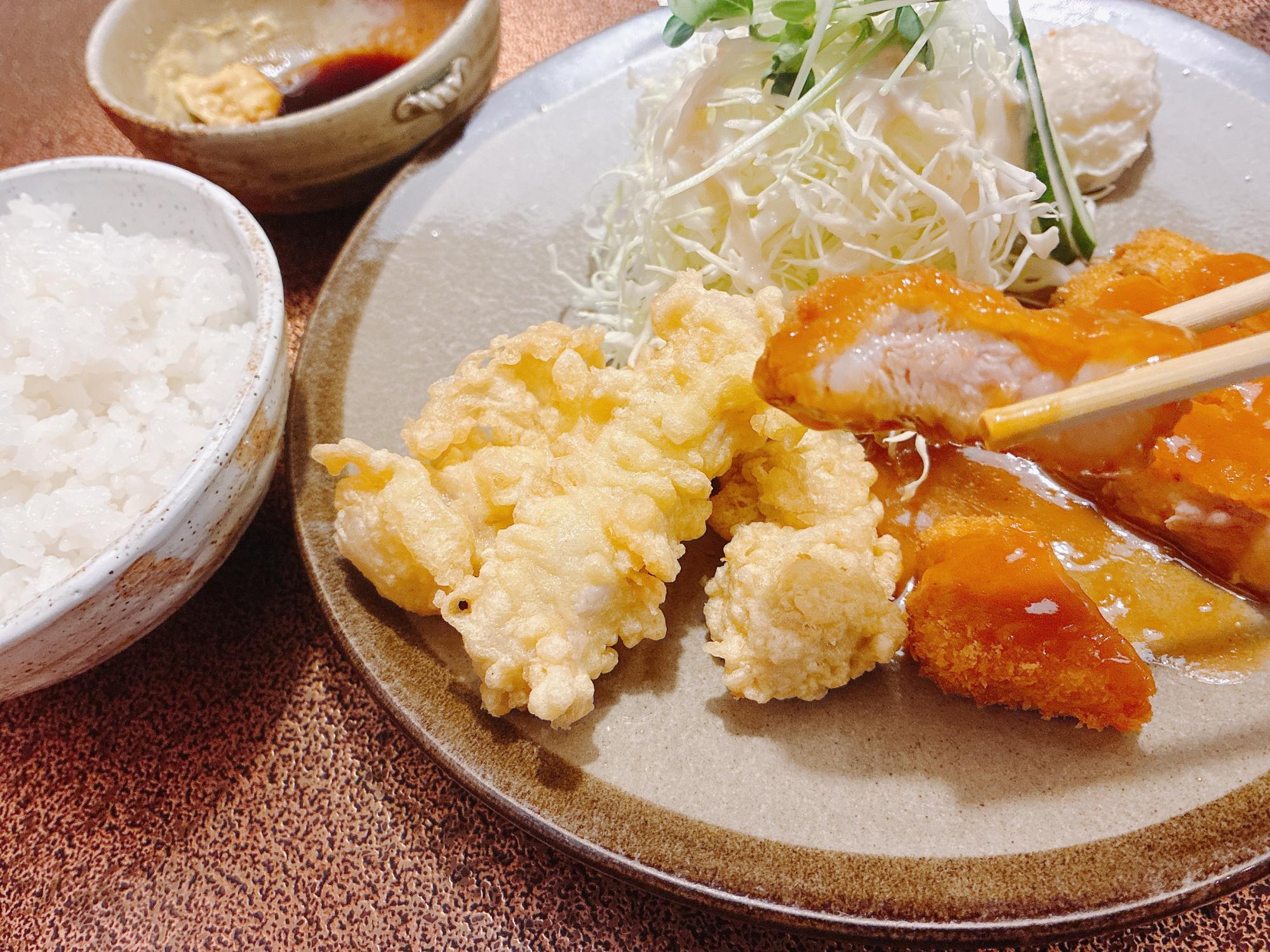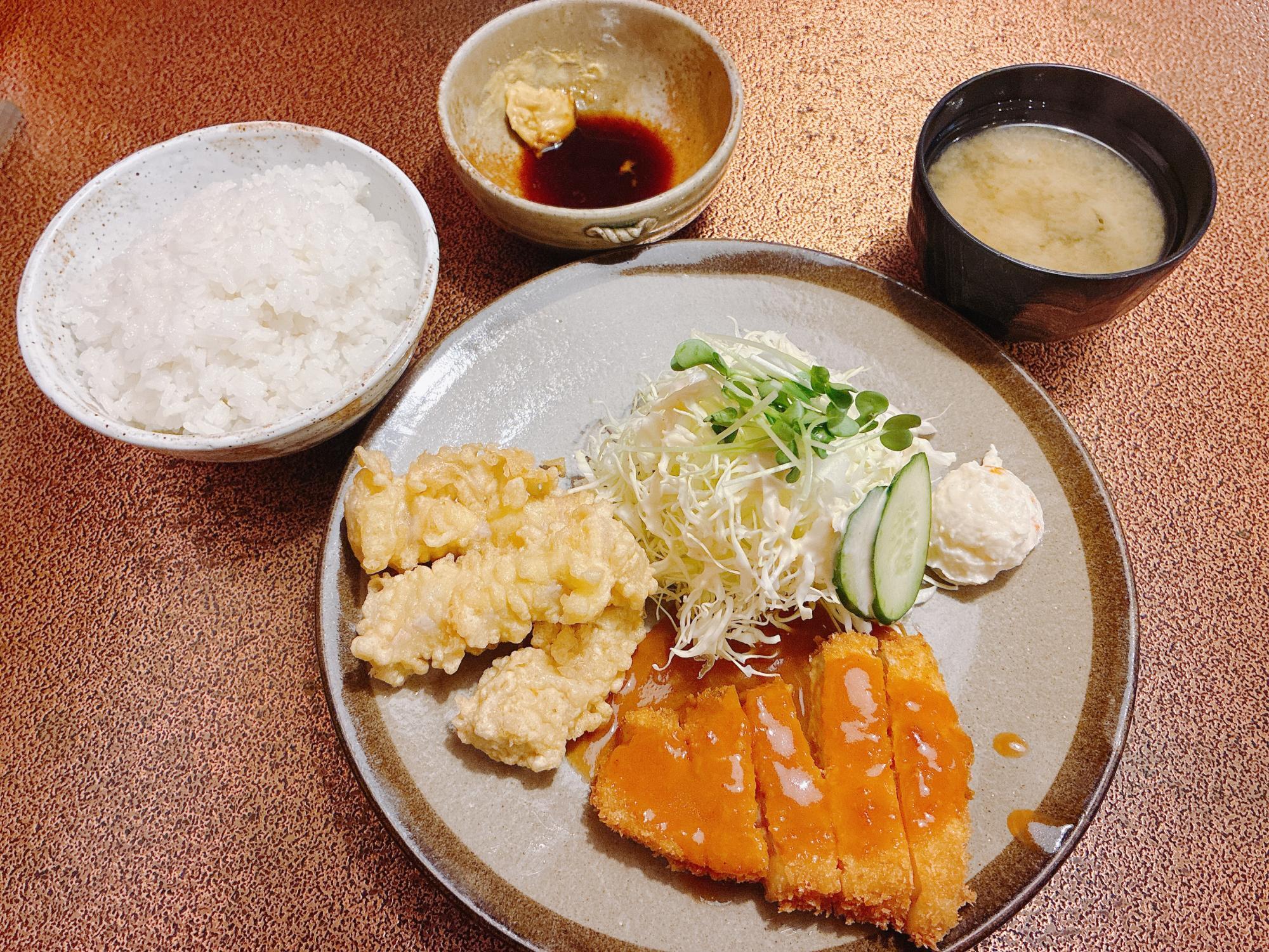 メインのお皿には、デミグラスソースがかかったとんかつと、白い衣のブタ天が仲良く並んでいます。さらに山盛りのキャベツとポテトサラダ、ご飯にお味噌汁まで付いてこのお値段は、とってもリーズナブルで嬉しいですね。