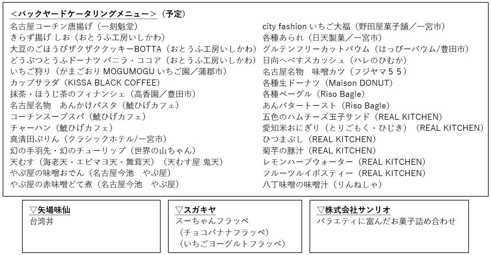 さらに、名古屋名物・台湾ラーメン発祥の名店として知られ、刺激的な辛さと旨みがやみつきになる一杯で全国にファンを持つ矢場味仙から新名物の「台湾丼」、名古屋市発祥で中部を中心に展開する人気ラーメンチェーンのスガキヤから、一足先に3月発売の新作スイーツ「スーちゃんフラッペ」、世代や国境を越えて愛され続ける日本発のキャラクターエンターテインメント企業株式会社サンリオから、ハローキティメロンパンビスケットなど、かわいくて美味しい「バラエティに富んだお菓子詰め合わせ」も登場します!♡