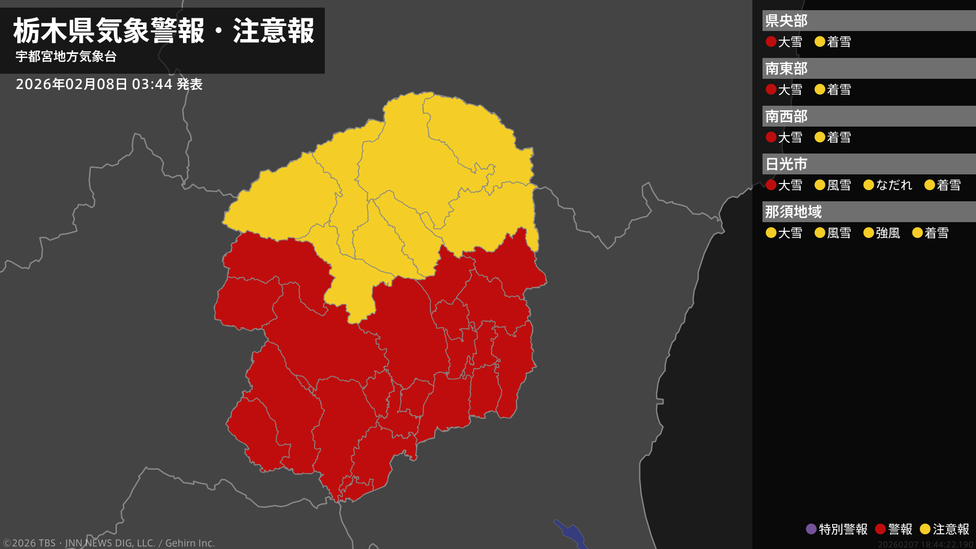 気象台は、午前3時44分に、大雪警報を宇都宮市、足利市、栃木市、佐野市、鹿沼市、日光市日光、日光市足尾、小山市、真岡市、さくら市、那須烏山市、下野市、上三川町、益子町、茂木町、市貝町、芳賀町、壬生町、野木町、高根沢町、那珂川町に発表しました。またなだれ注意報を日光市日光、日光市藤原、日光市足尾、日光市栗山に発表しました。