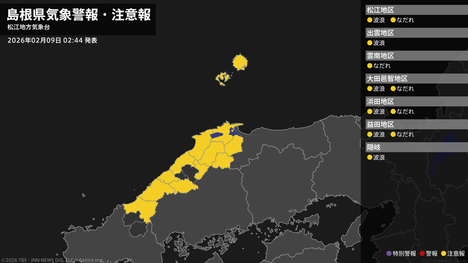 島根県では、9日夕方まで高波に注意してください。東部、西部では、10日までなだれに注意してください。